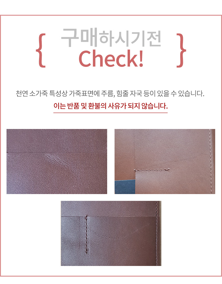 - 천연가죽제품의 특성상 각 제품마다 주름 등의 모양 차이가 있을 수 있으며, 가죽 자체의 얼룩이나 점이 있거나